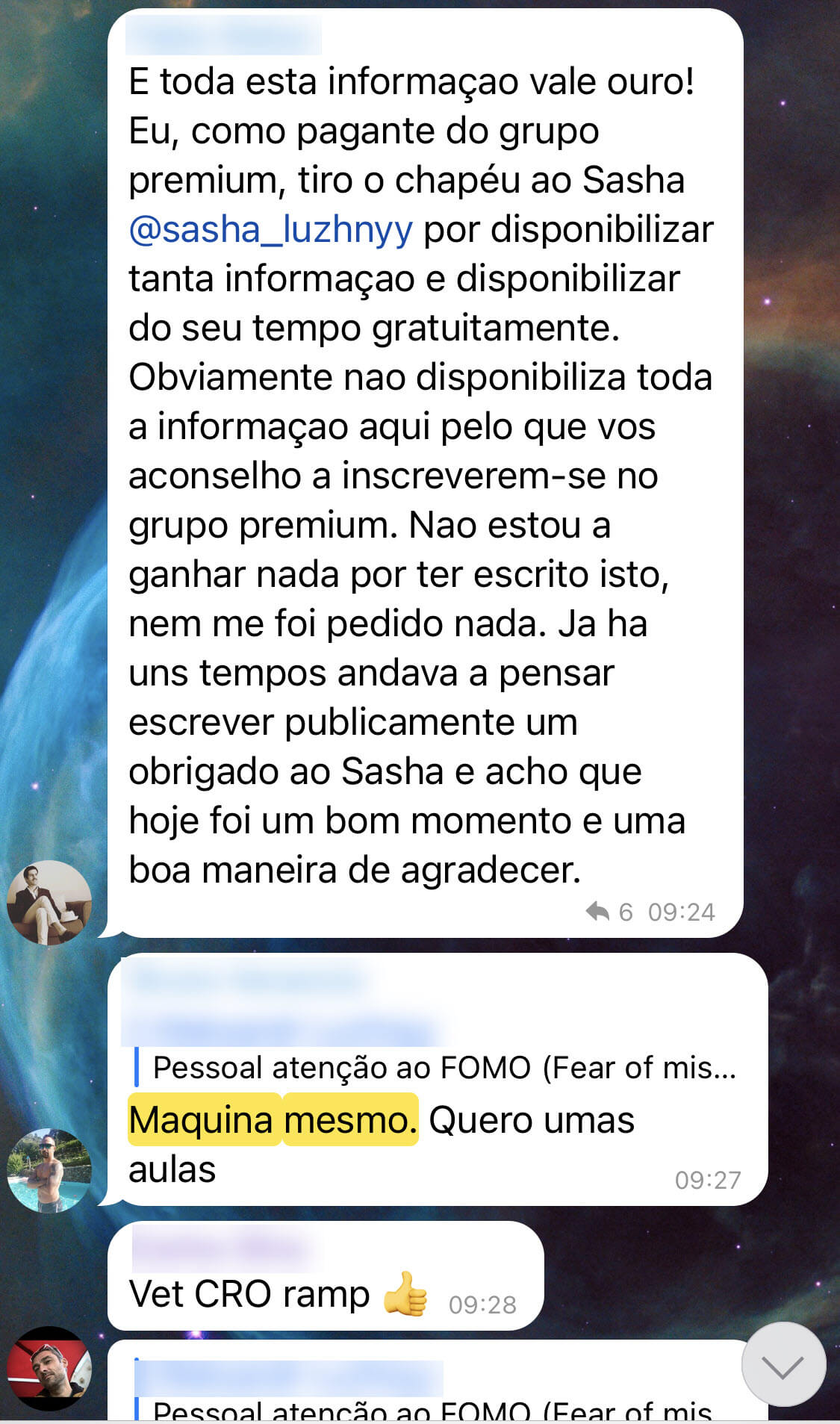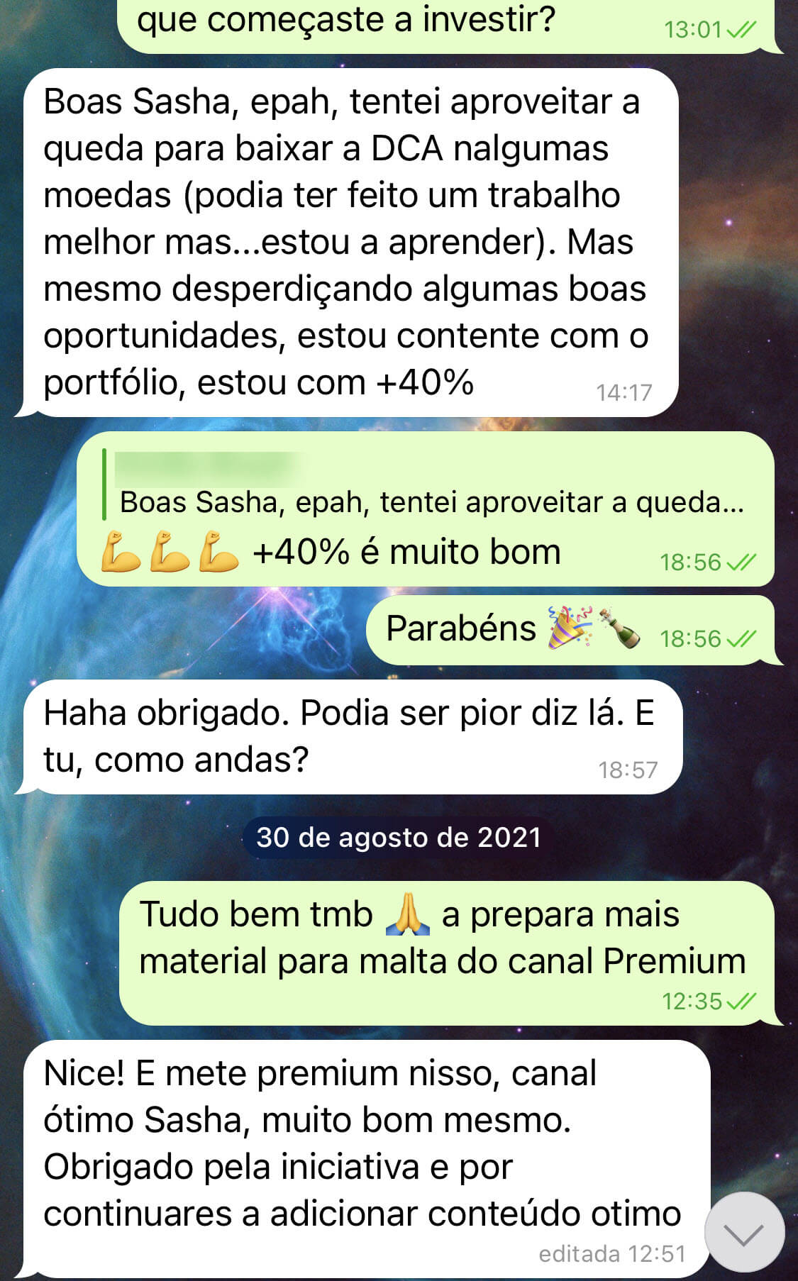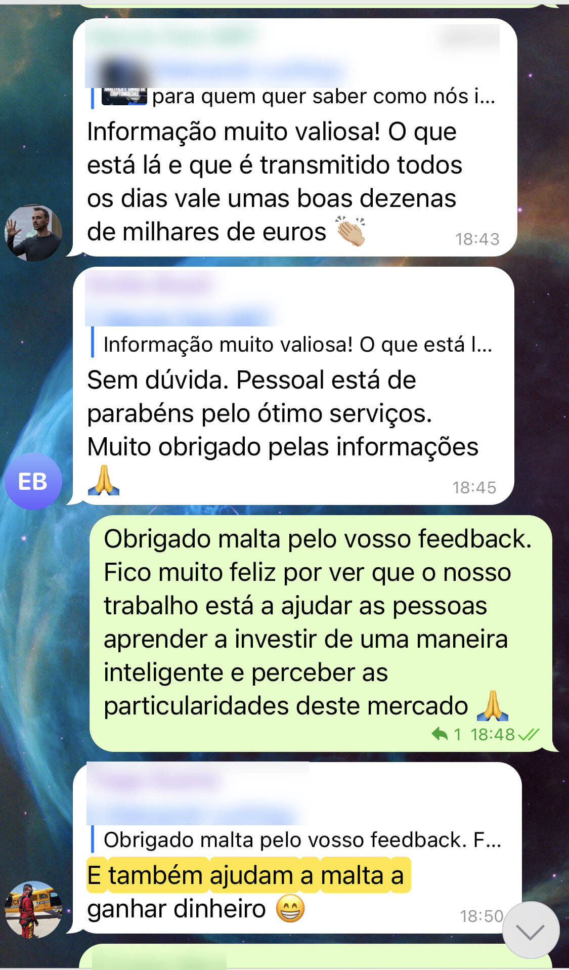 Neste grupo poderás interagir com outros participantes PREMIUM, tal como seguir os nossos investimentos, negociações e portfólio em tempo real.
